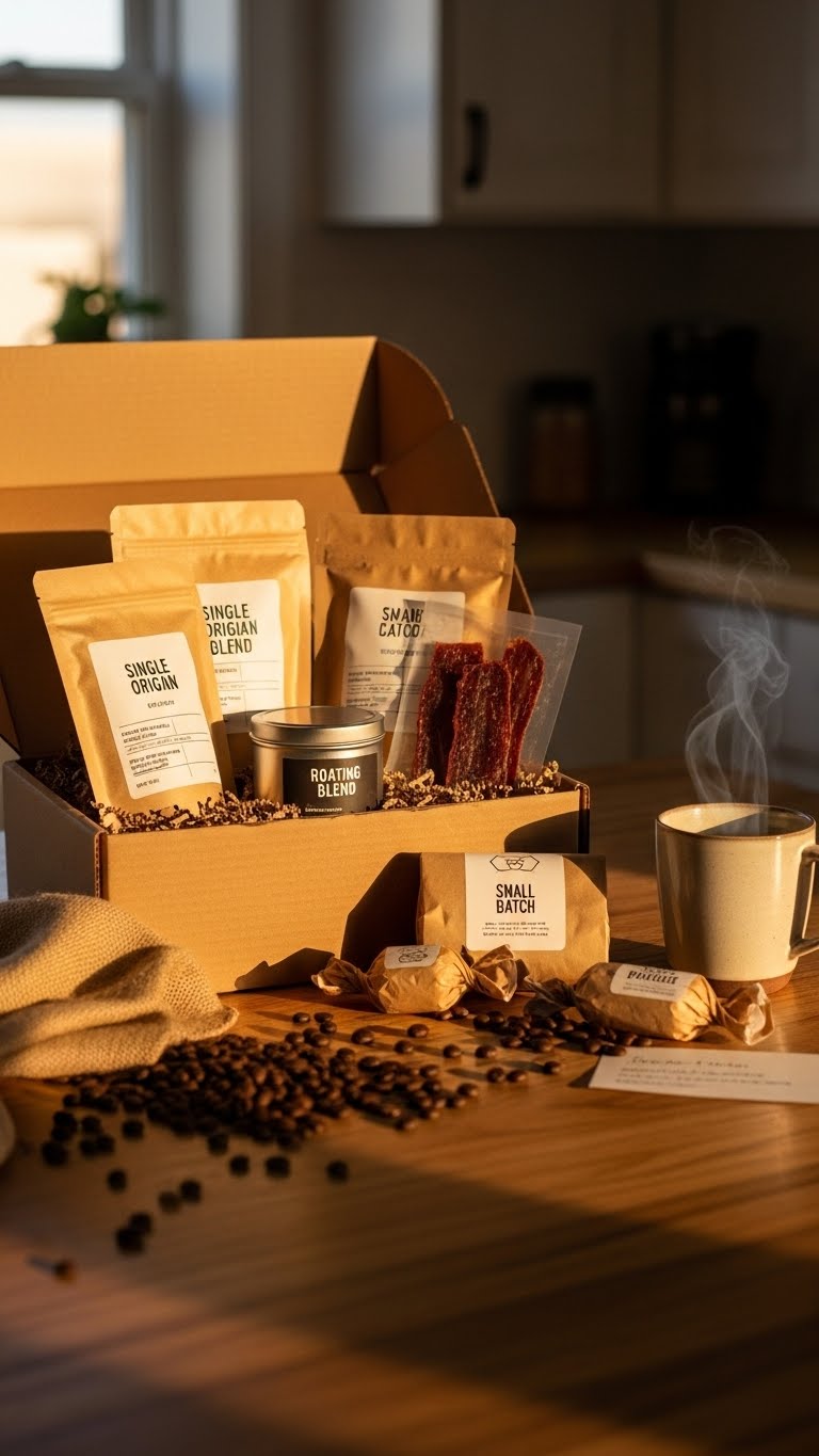 You’ll choose single origin roasts, rotating blends, and artisan jerky or small-batch confections.
