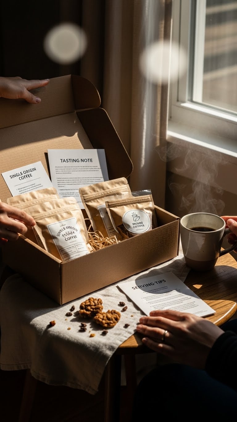 You’ll choose single origin beans or curated snacks, each box including tasting notes and serving tips.