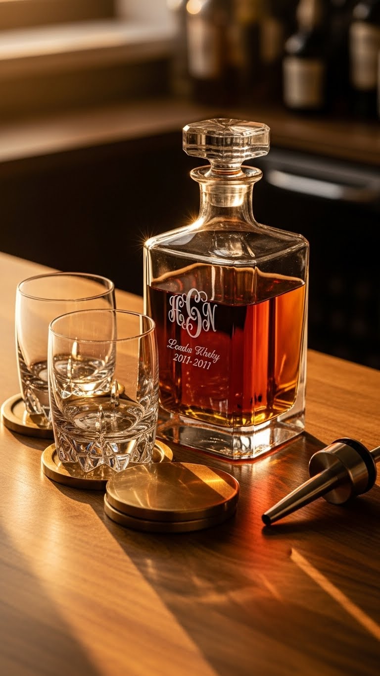 Elevating his home bar with an engraved whiskey decanter and custom barware gives a personal, tactile luxury he actually uses—crisp lead-free crystal catching light, a laser-etched monogram or meaningful date, and matching tumblers weighted for the perfect sip.