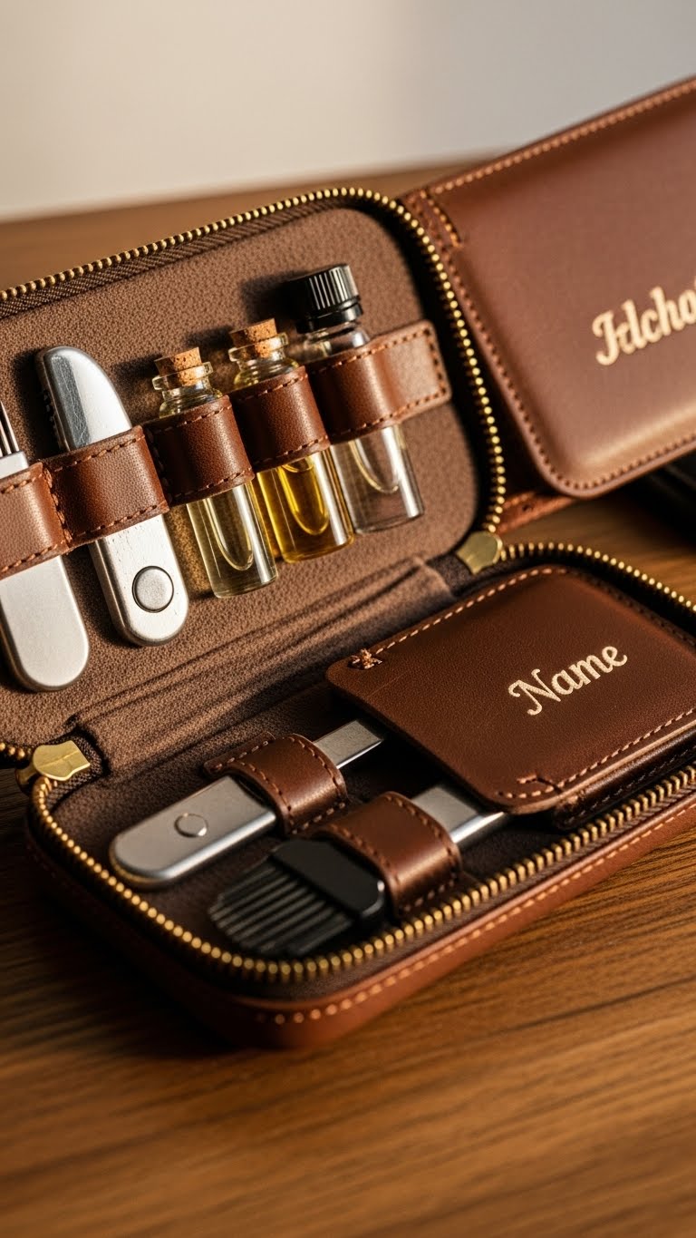 Handcrafted and practical, a tailored grooming kit with his name embroidered turns daily routines into a small, stylish ritual. You’ll pick compact tools, scented oils in glass vials, and a slim travel case that slips into any bag. Personalization feels freeing: it’s useful, elegant, and unmistakably his. Small details — sturdy zippers, soft lining — show you noticed what matters.