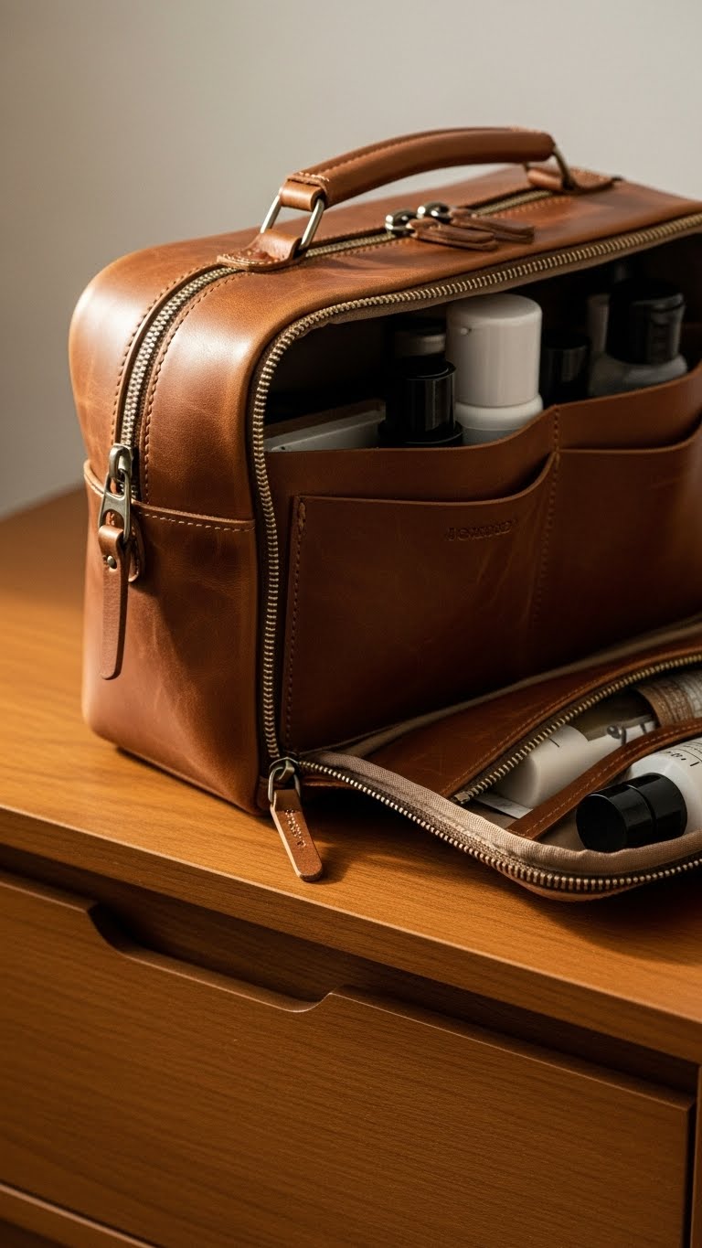 A rugged-yet-refined leather dopp kit makes travel feel intentional, not chaotic: you’ll zip open a compact case and find well-organized pockets for toiletries, a wide-mouth opening for easy access, and a supple hide that wears in with character.
