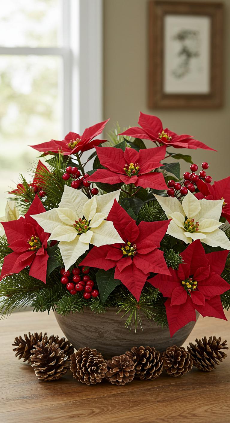 Poinsettias are synonymous with the holiday season. They bring a traditional touch to any rustic décor. Use a handcrafted bowl for a unique display. Choose a mixture of red and white flowers for contrast. Surround your arrangement with pinecones and evergreen sprigs for added texture. You can easily create this style on a budget by sourcing flowers from a local market. A simple DIY tip is to use vintage containers you may have at home. Get creative, and personalize your arrangement to express your holiday spirit.