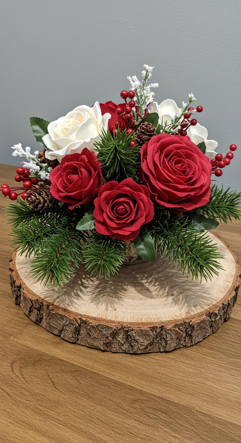 Creating flower arrangements on wood slice bases ties everything back to nature. Use wood rounds as a simple base for your arrangement. This style is budget-friendly as you can find slices at craft stores or cut your own. Arrange vibrant red and white blossoms with greenery on top for striking visuals. This natural base elevates the rustic charm, serving as a perfect centerpiece for your holiday table.