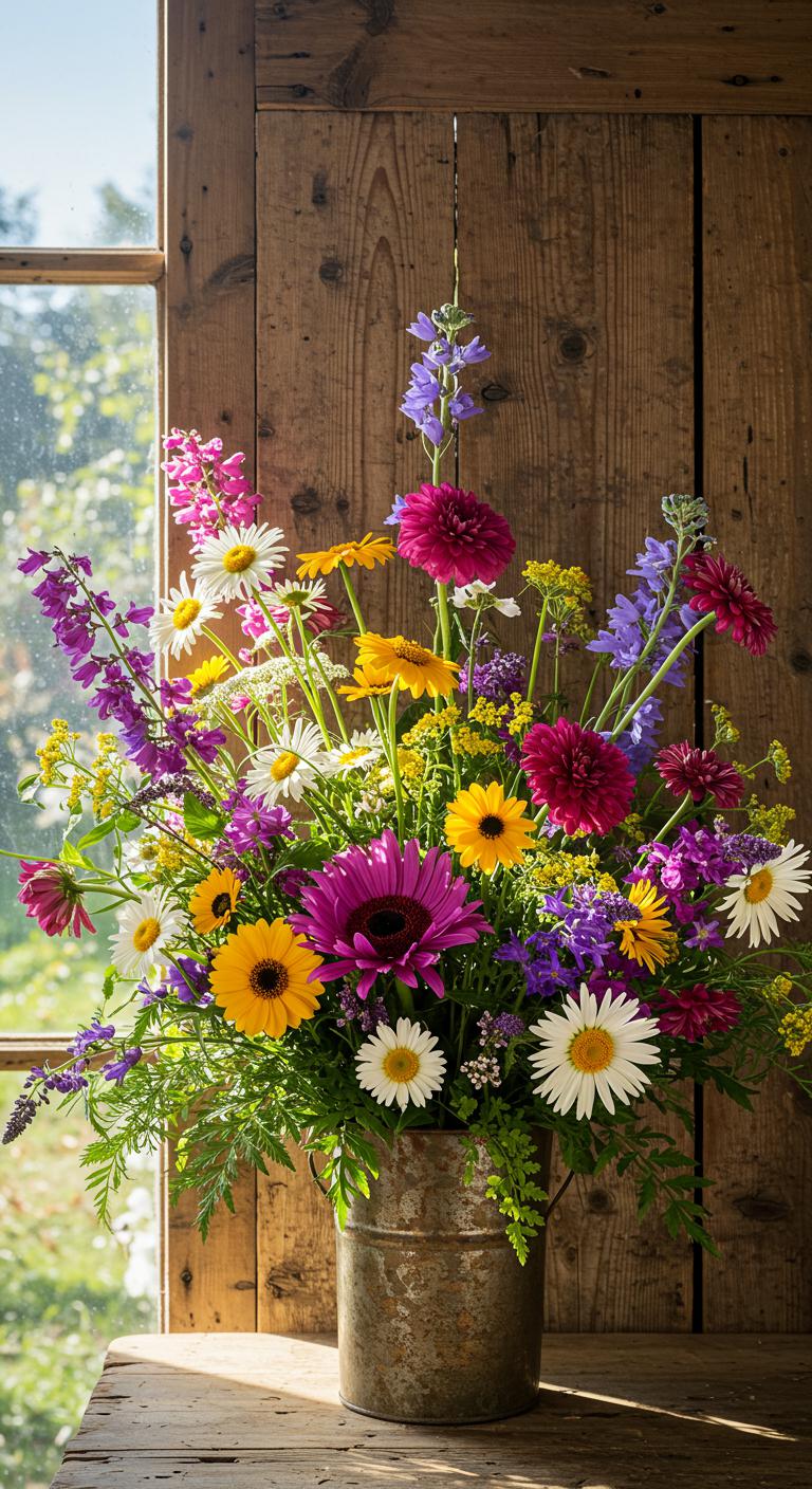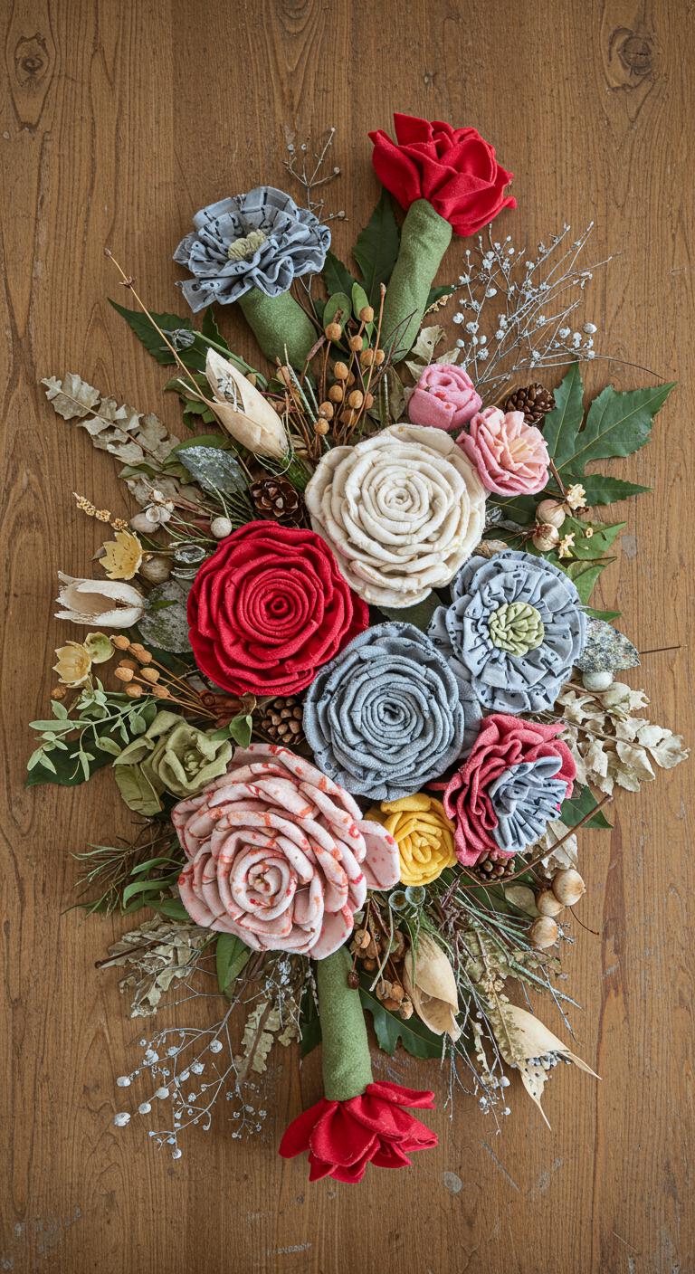 Fabric flowers mixed with natural elements can give an unforgettable whimsical touch. Use soft fabrics like linen or felt to cut flower shapes. Combine them with natural foliage to create an arrangement that won’t wilt. Unique fabric textures add a homey vibe, making them memorable for guests. You can sew or glue the flowers together easily. This style is a fun and budget-friendly DIY project you can enjoy with family or friends.