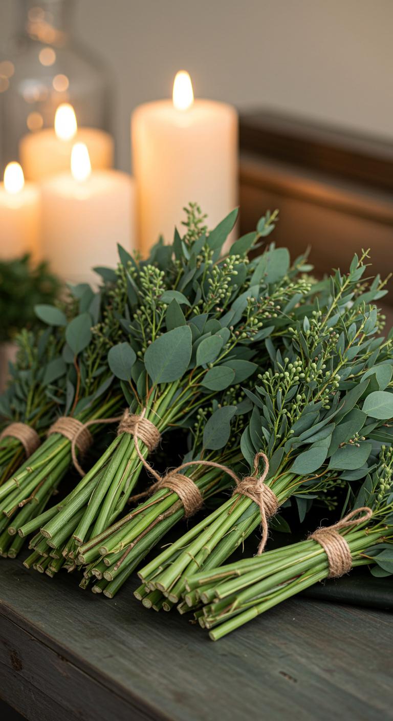 Eucalyptus and sweetgrass create a soft, fragrant arrangement that fits perfectly in a rustic setting. These greens are beautiful together and can be tied into bunches with twine for texture. Place them in a simple vase or lay them flat as a table runner. Both materials are easy to source from grocery stores or local markets. This blend not only beautifies your space but also adds a refreshing scent to your home.