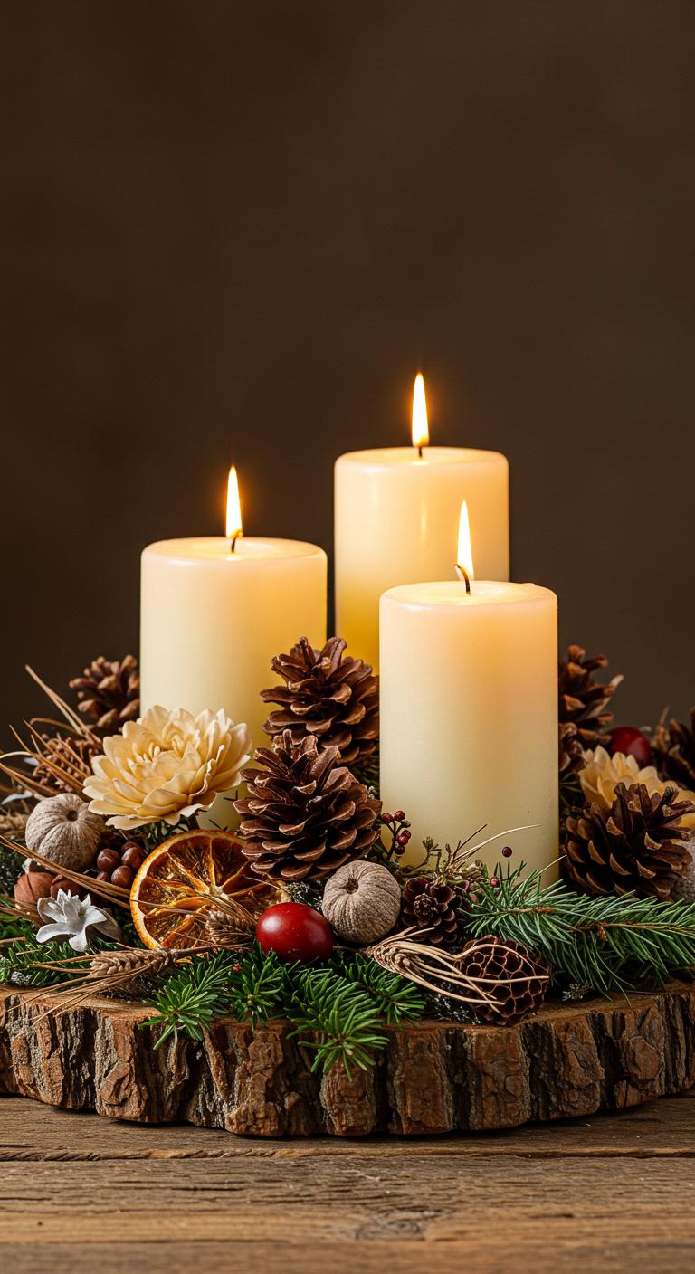 Use candles to create a charming arrangement filled with seasonal flowers. Choose a central pillar candle and smaller tealight candles around it. Create a base with evergreen, berries, and pinecones. The contrast between the flowers and the soft glow of the candles adds magic to your decoration. Craft stores offer candle supplies at reasonable prices. This delightful project can be made quickly and will significantly enhance your table setting.