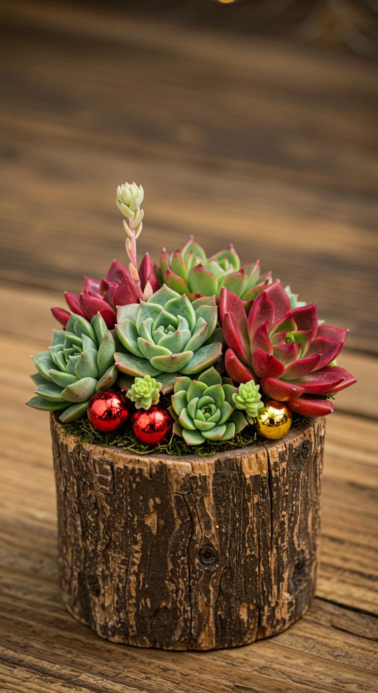 Succulents can be surprisingly effective for rustic holiday arrangements. Select various types and colors for a unique display. Arrange them in rustic wooden planters or terrariums and include festive decorations like tiny ornaments or cinnamon sticks. Succulents are low maintenance and can last through the season. You can purchase small plants at garden centers for reasonable prices. This arrangement is a fresh approach to your holiday décor.