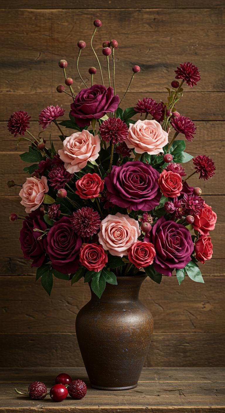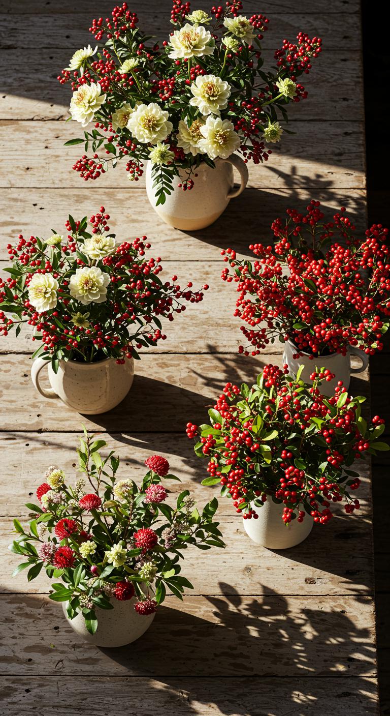 Soft berry bouquets are a charming way to complement rustic Christmas décor. Use blooms like white roses or soft pastels for contrast against red berries. Rustic pottery or vases add a homespun feel to the arrangements. This style can be easily DIY to keep costs low. Gather your materials at local markets, or even grow your own. Incorporate dried flowers as accents to maintain your arrangements well past the holiday season.