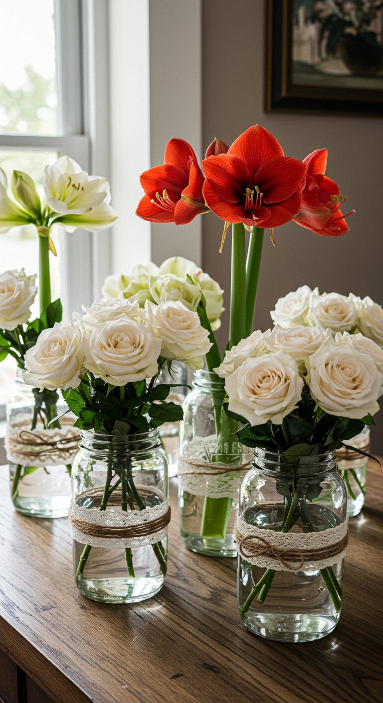Vintage glass jars make delightful containers for rustic arrangements. They provide a unique touch to your floral display. Arrange seasonal favorites like roses and amaryllis in each jar for variety. The beauty of using jars is their accessibility; you can find many for a low price at antique or thrift stores. For a whimsical touch, personalize each jar with twine or lace. Group them together or spread them throughout your space to create a cohesive look.