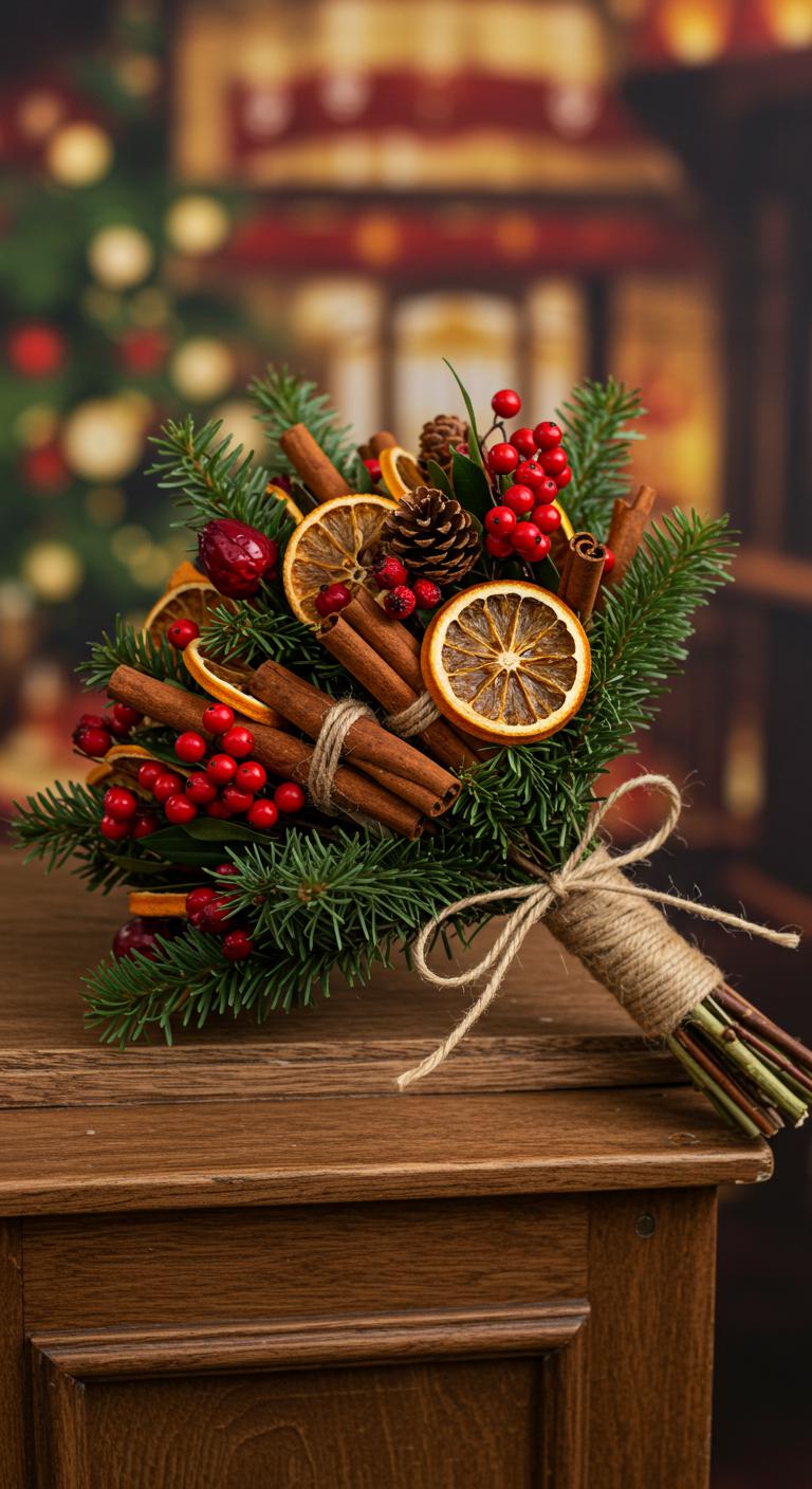 Transform your rustic arrangements by incorporating dried citrus slices and spices. The combination not only looks beautiful but smells delightful too! This style involves simple steps: dry orange or lemon slices in the oven, and pair them with cinnamon sticks and berry sprigs. Use a twine ribbon to tie them into a festive bouquet. This method is not only budget-friendly but also eco-conscious, as you can reduce waste and re-use what’s already available in your kitchen.