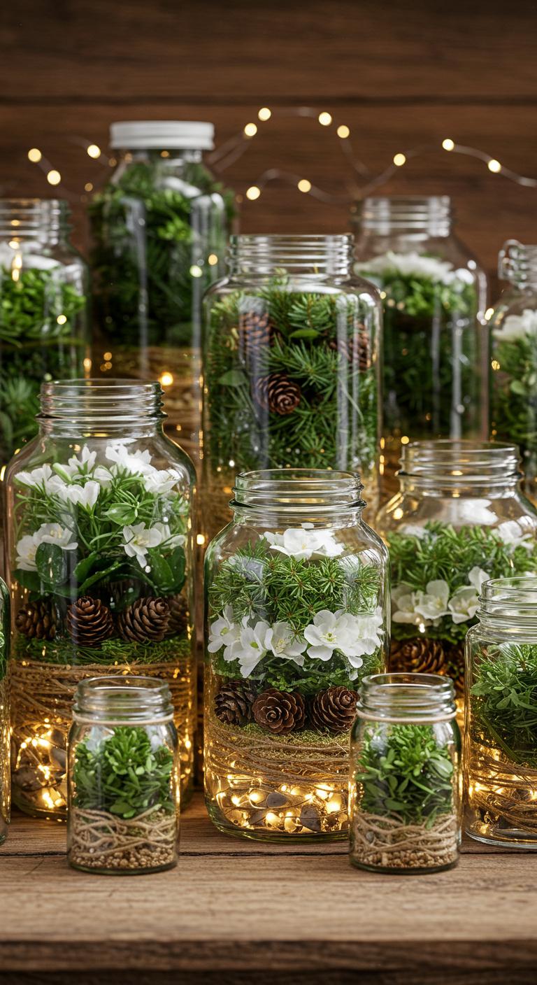 Layered jar arrangements bring a rustic yet elegant feel to your holiday décor. Use various glass containers to create depth. Start with a base of evergreen foliage, followed by a pop of white flowers, and finish with pinecones or berries. Mixing height and texture keeps the arrangement visually appealing. You can find jars easily from recycling or arts and crafts stores to keep costs down. Use this layered approach on tabletops or mantels to celebrate the season.