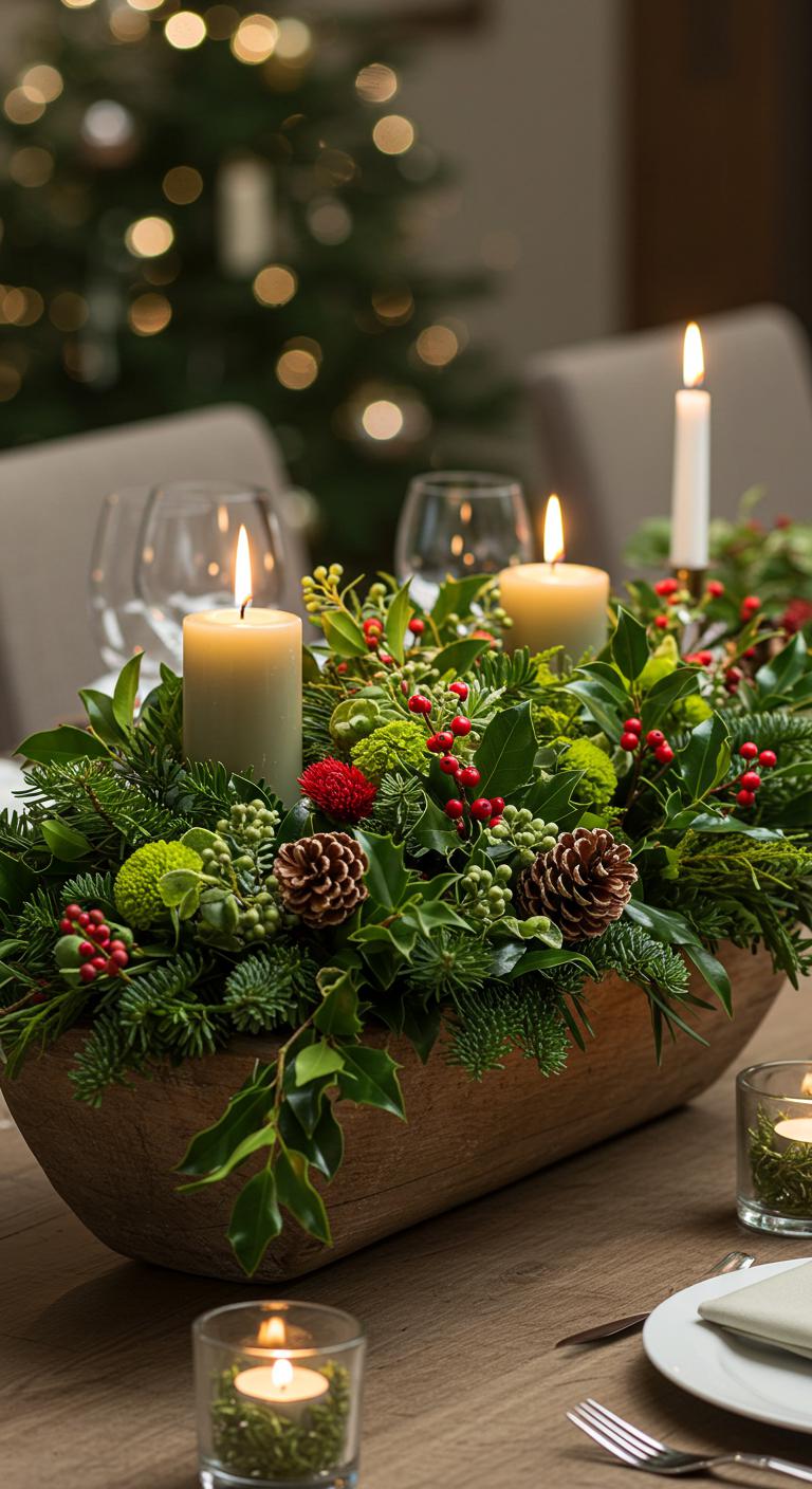 A mixed greens centerpiece creates a lush display for your holiday table. Combine different types of greenery such as holly, evergreen sprigs, and faux branches. The variety adds depth and richness. Use a rustic wooden trough or shallow bowl to hold your arrangement. This style can be easily created on a budget by sourcing local grasses and branches. Enhance with a few soft candle lights for evening gatherings or festive dinners.