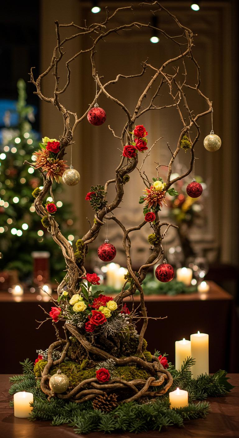 Twisted branches can create a unique focal point in your floral arrangements. Use branches from your backyard or craft store. Combine with simple flowers, like white chrysanthemum or red tulips, to contrast with the texture of the branches. Arrange them in vases with floral foam or simply in water for a more casual approach. This design adds character and can be a great DIY project, bringing an artistic touch to your seasonal décor.