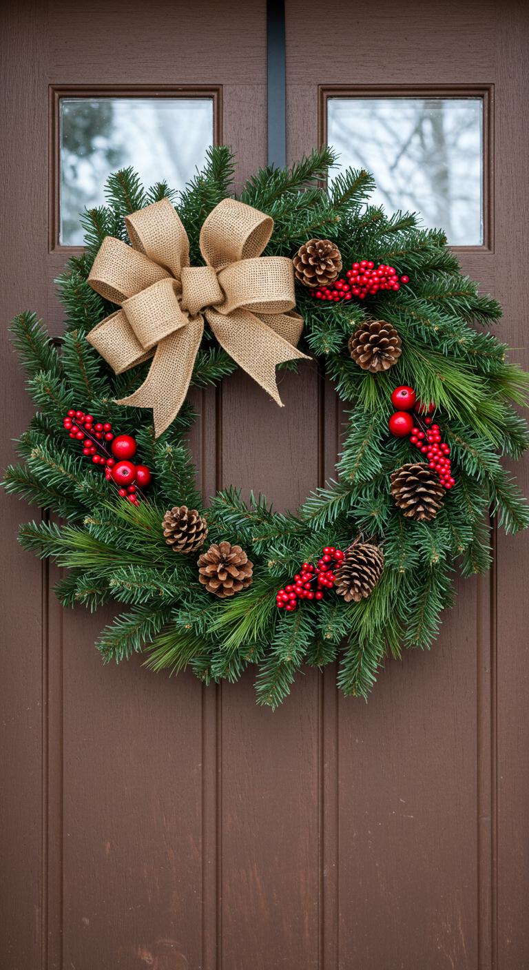 A classic evergreen wreath introduces the charm of the holiday season right at your entrance. Use fresh-cut pine branches, sprigs of holly, and even some red berries for color. If you want to save money, consider using branches from your backyard mixed with a few store-bought elements. DIY wreath-making is simple; all you need is a wire frame. Fashion the branches in place and secure them with floral wire. Decorate it further with burlap ribbon or any other materials you have at home. This handmade touch offers warmth without spending too much.