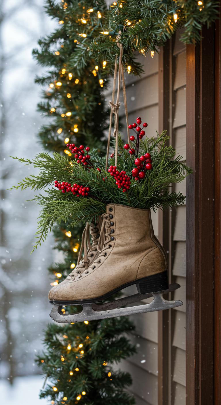 Add character to your porch with a vintage skates display. If you have a pair of old skates, fill them with seasonal greens or fairy lights. You can often find skates at thrift stores or in your attic. Hang them from your porch ceiling or a sturdy beam. To ensure they stay secure, tie a strong twine to the top. This display offers a reminder of joyful winter activities and serves as a unique conversation starter.