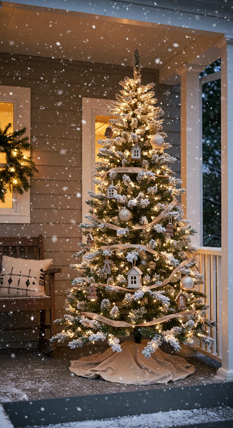 A flocked Christmas tree creates a winter wonderland effect on your porch. You can purchase these or create faux snow using easy DIY flocking sprays. Decorate your tree with rustic ornaments, burlap ribbon, and string lights for a cohesive look. Include a few handmade elements for an authentic touch.