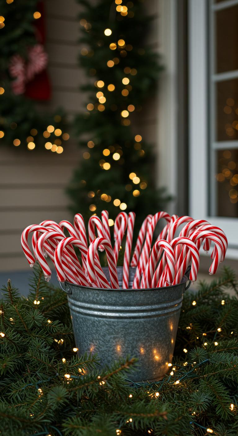 Incorporate interactive candy cane accents to infuse sweetness into your decor. Place a bucket filled with oversized candy canes at the entrance, inviting visitors to grab one. You can make it affordable by buying candy in bulk. Dress the bucket with burlap or seasonal fabric to match your theme.