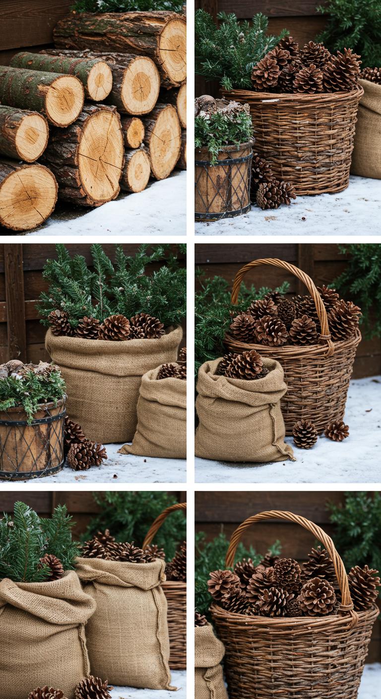 Showcase natural textures by stacking logs or using burlap sacks filled with seasonal greens on your porch. These elements provide depth and warmth to your decor. Look for logs in your yard or buy inexpensive burlap at craft stores. Experiment with arrangements to create different height levels and a layered look.