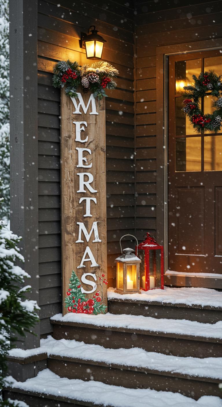 Add a welcome sign to your porch for a charming personal touch. Use reclaimed wood to create a rustic sign. Paint it with festive phrases like “Merry Christmas” or “Welcome to Our Home.” Easy DIY kits can be found at craft stores, or create one yourself using stencils and outdoor paint to withstand the weather.