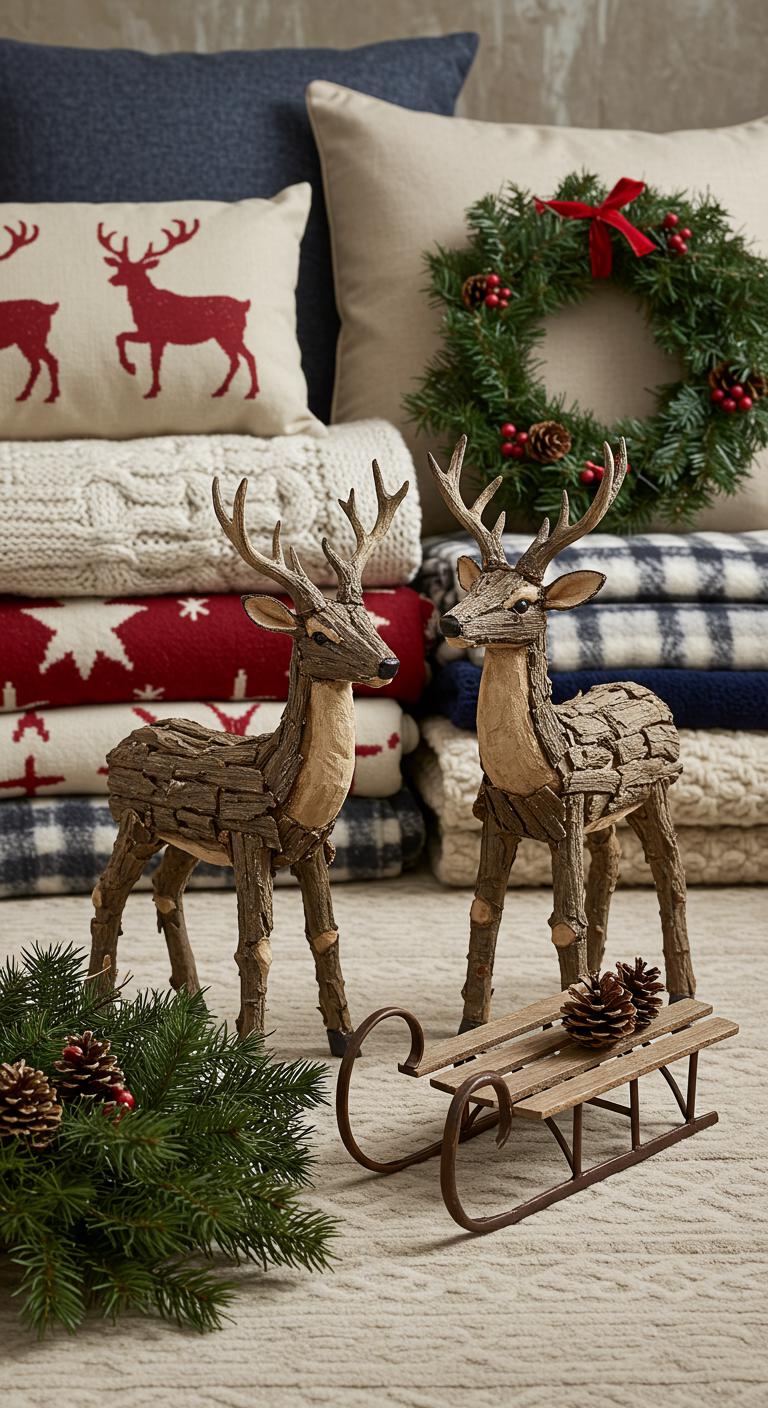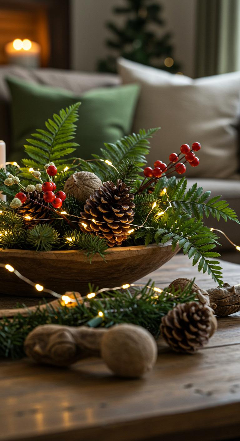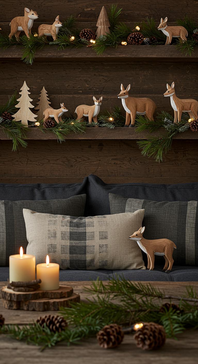 Integrate woodland-themed accents to enhance your rustic living room. Use small, charming items like figurines of woodland creatures, mushrooms, or branches artfully arranged among your decor. Collect natural items from your surroundings, such as small branches, to use as table centerpieces. These woodland touches add that rustic flair and create a cozy storytelling atmosphere, perfect for drawing everyone together this holiday season.