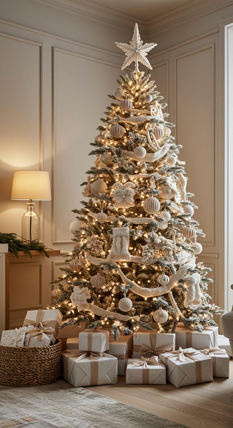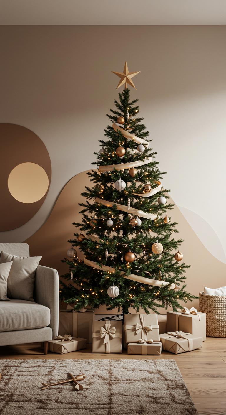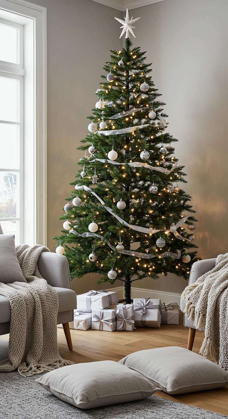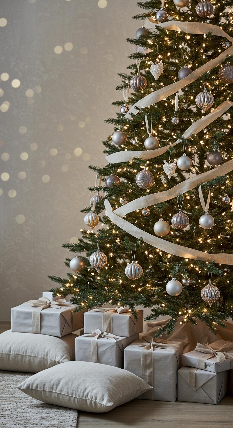 Choosing a palette of soft gray and beige elevates your Christmas tree into a sophisticated masterpiece. These muted tones create a serene backdrop for your decorations. Stylish matte ornaments and linen ribbons can add texture without overwhelming the design. For a budget-friendly approach, consider crafting your decor using felt or fabric remnants. You can make simple ornaments or bows to hang from your tree. This understated elegance is perfect for creating a calm holiday ambiance where everyone feels at home.