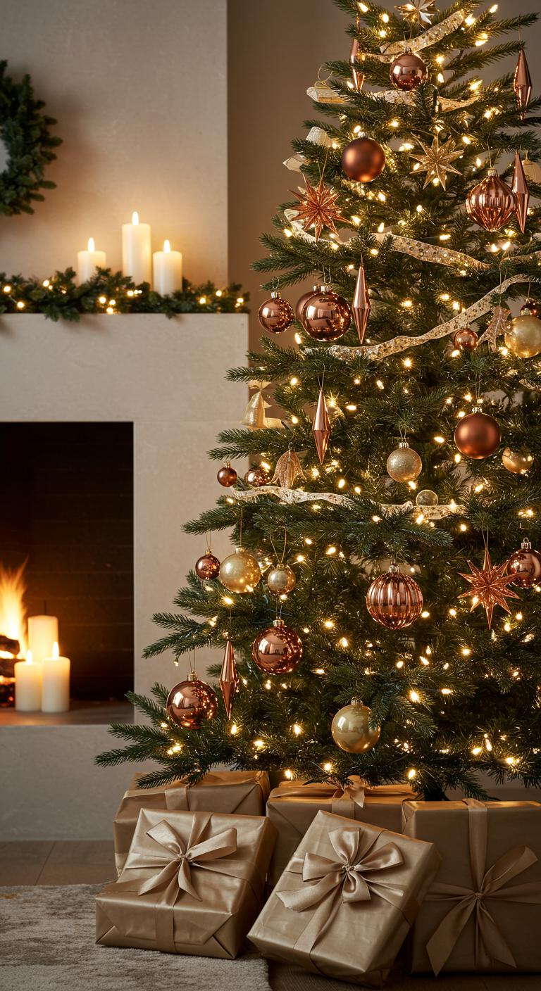 Metallic accents can add a touch of glamour to a neutral Christmas tree. Using brass, copper, or gold ornaments against soft whites creates a luxurious contrast. To keep things affordable, consider spray painting basic ornaments in metallic shades. Or, you can look for discount stores for chic yet budget-friendly metallic decor. Just a few strategically placed pieces can add sparkle without overwhelming the neutral palette. Pair these metallics with white lights to maintain a cozy, inviting atmosphere.