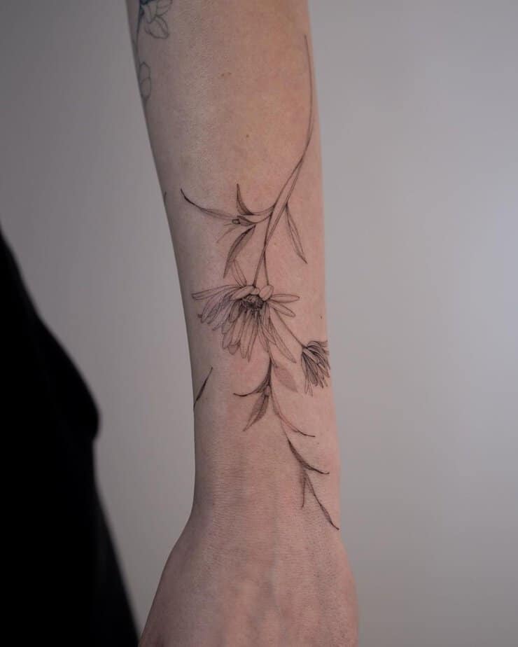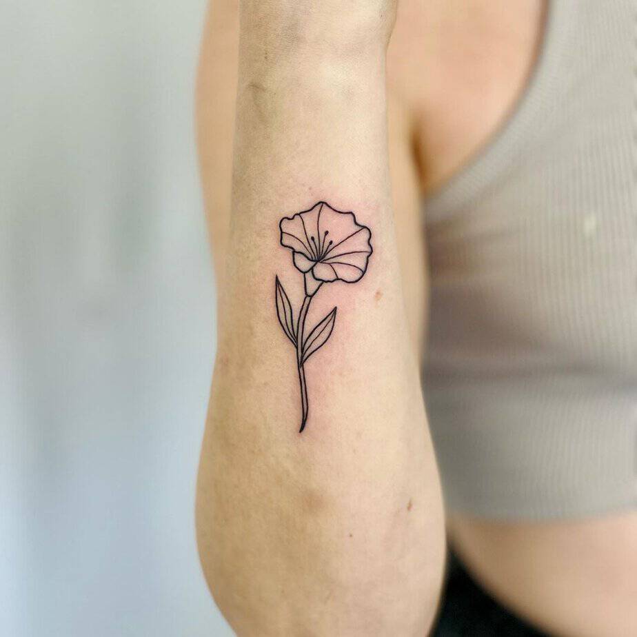 If you want something classic and dainty, this one’s calling your name — both an aster and a morning glory, done in fine line on the upper arm. It’s visually gentle but emotionally packed: asters nod to change while the morning glory whispers new beginnings, a little tattoo reminder that you can always start again.