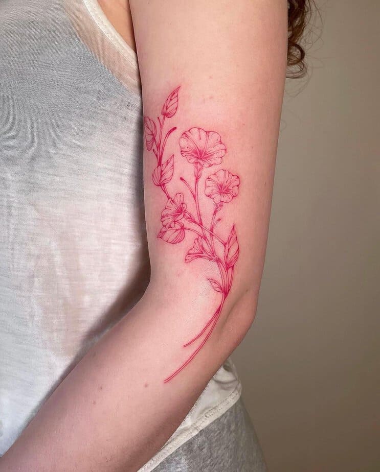 There’s something about red ink that makes a piece feel alive, and this morning glory flows from upper arm to forearm like it’s reaching for the sun. Beyond the eye-catching color, red morning glory is all about true love and passion — perfect if you want a tattoo that’s romantic and brave enough to shout it a little.