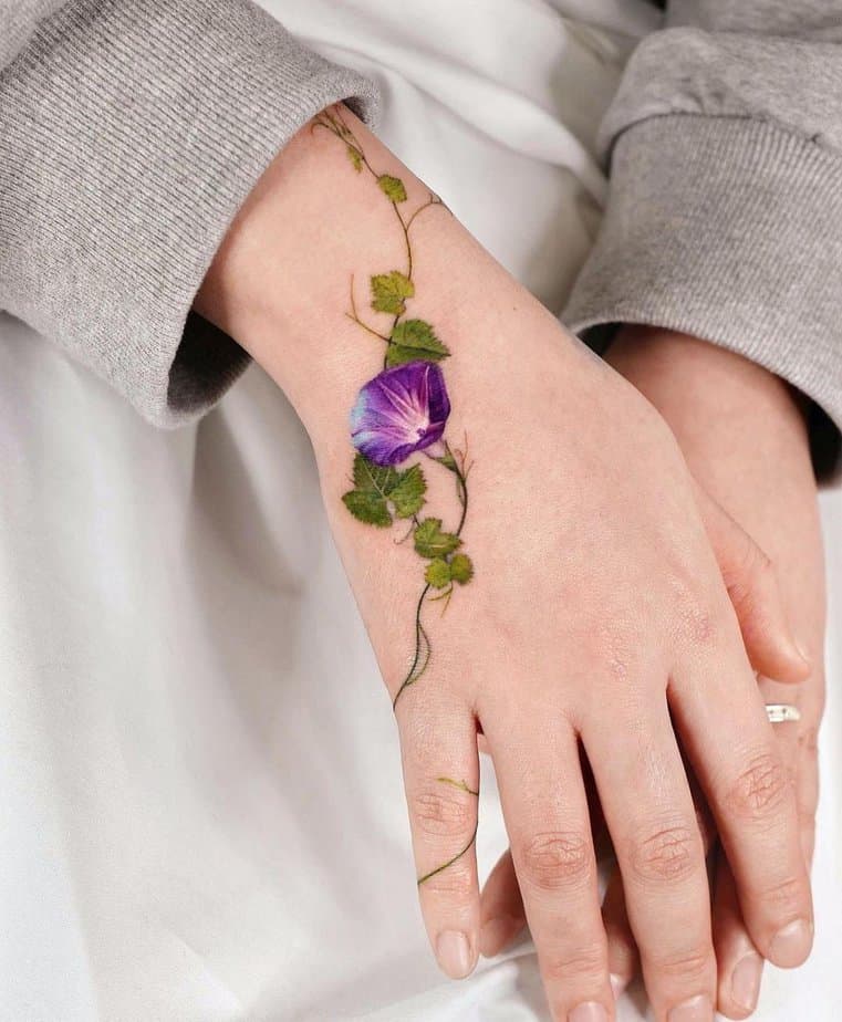 A realistic morning glory on the hand is daring and gorgeous. It’s the kind of design that draws attention and curiosity — bright, intricate, and a touch mysterious.