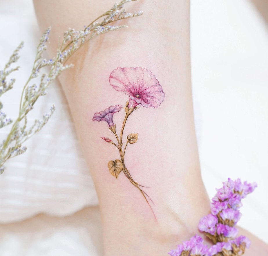 Tiny morning glories in pink and purple make for a cute ankle piece that still feels full of meaning. Pink vibes the sweetness of new romance, purple speaks to a deeper bond — together they read like a promise that love can grow steady and true, not just fireworks and drama.