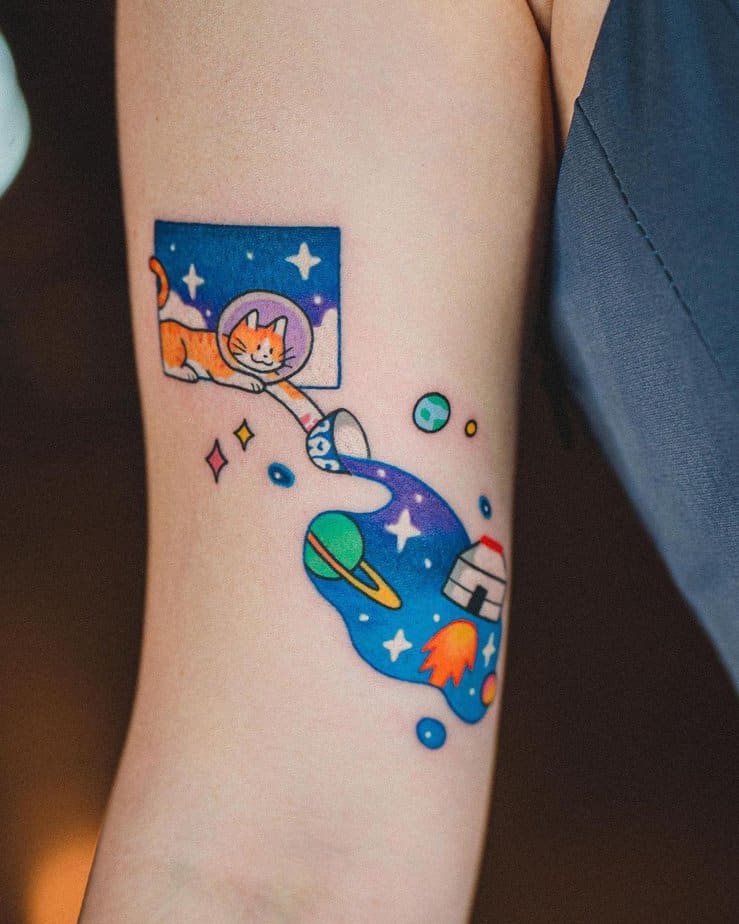 An orange kitty in an astronaut helmet knocks over a bowl and spills out stars, rockets, and planets — honestly adorable. It’s playful, nostalgic, and reminds you that curiosity and wonder don’t have to be serious. Let your inner child float among the stars sometimes.
