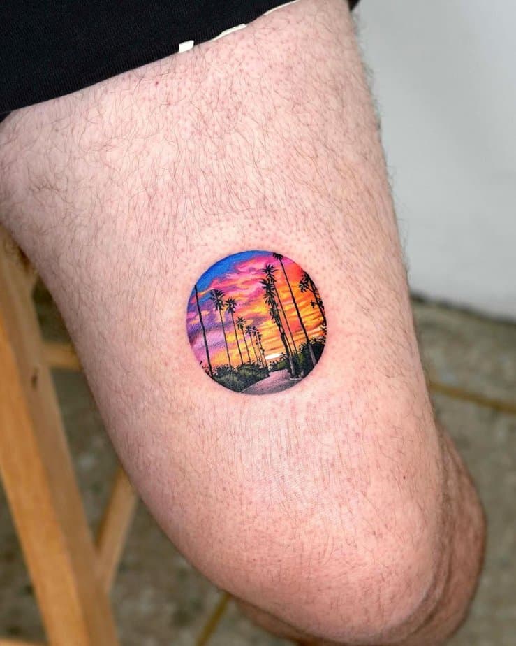 Small circular tattoo, huge Malibu vibes: palm trees, a golden-hour glow, and all the summer-party nostalgia rolled into one. It screams freedom and fun and reminds you how sweet those endless-summer days felt. Perfect if you want a tiny emoji of joy on your skin.