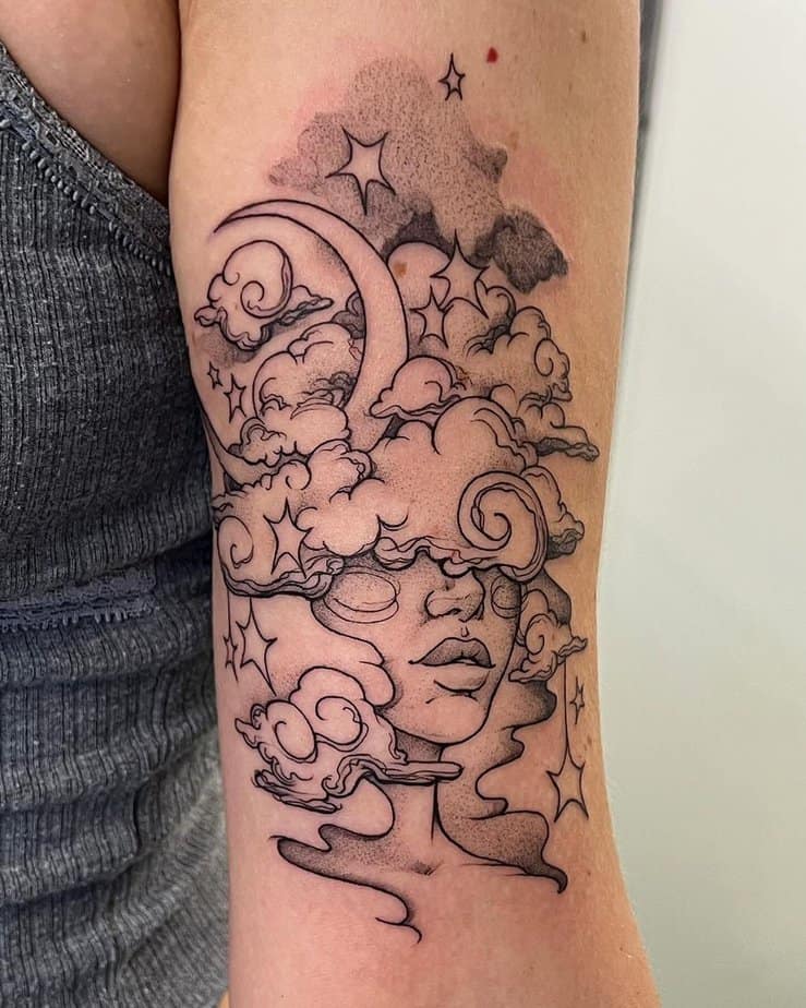 Half a woman’s face, the top of her head dissolving into clouds, stars, and the moon — it’s the perfect visual for daydreaming. Sometimes drifting off is how you find your next idea or your next hope. This tattoo celebrates that sweet, spacey part of being human.