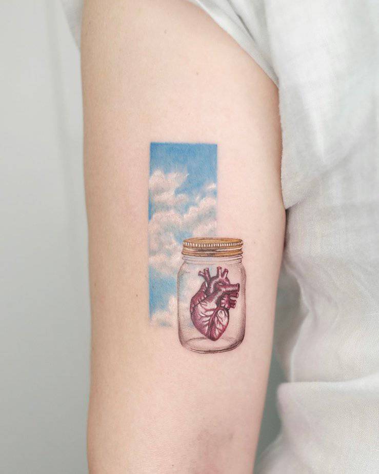 An anatomical heart inside a glass jar set against a blue sky — it’s tender and kind of poetic. The jar feels like protection, like holding onto memories or feelings you don’t want to lose, while the sky behind it whispers hope and possibility. It balances keeping safe with reaching for more, which is honestly the emotional plotline of many adulting days.