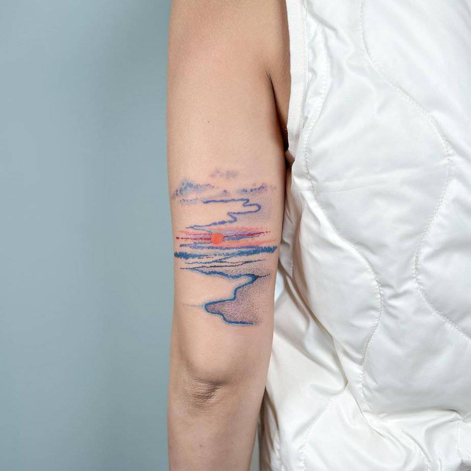 This upper-arm piece blends ocean blue into sky blue so seamlessly that you almost feel the salt on your skin. Fluffy clouds float above and a warm orange sun kisses the horizon. It’s peaceful, yeah, but it’s also freeing — the kind of tattoo that looks at you and says, “breathe; there’s more out there.” It nudges you toward calm horizons and the idea that some things are just made to soothe.