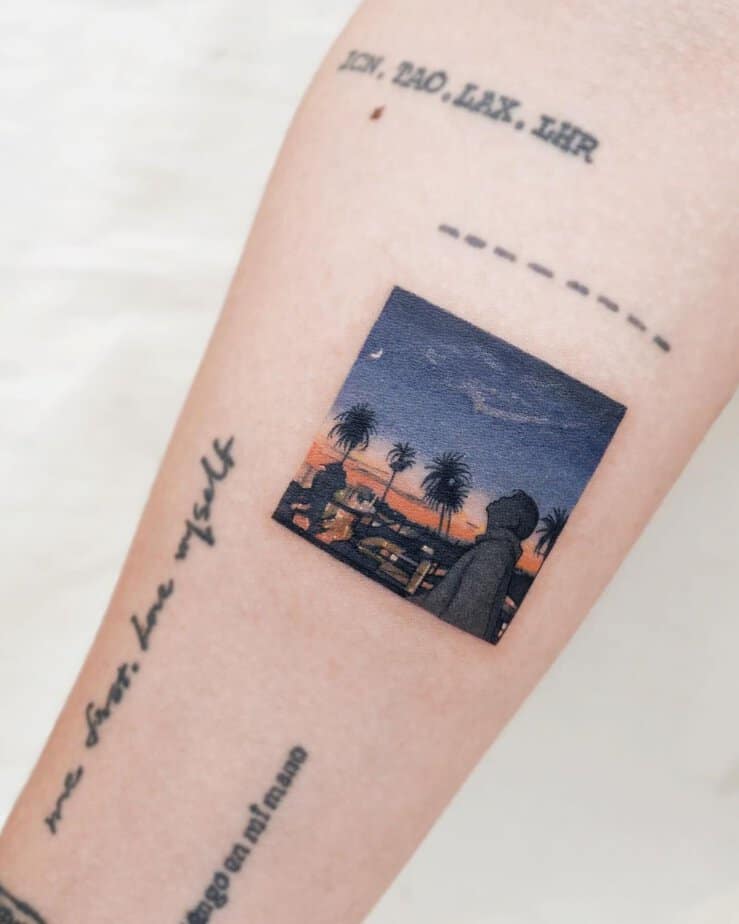 A small square shows a young man staring up at a night sky, with palm trees and city lights below. It’s mysterious and kind of cinematic — the vibe of someone wondering what’s out there and dreaming without limits. If you’re into ink that nudges you to think bigger, this one’s a quiet manifesto.
