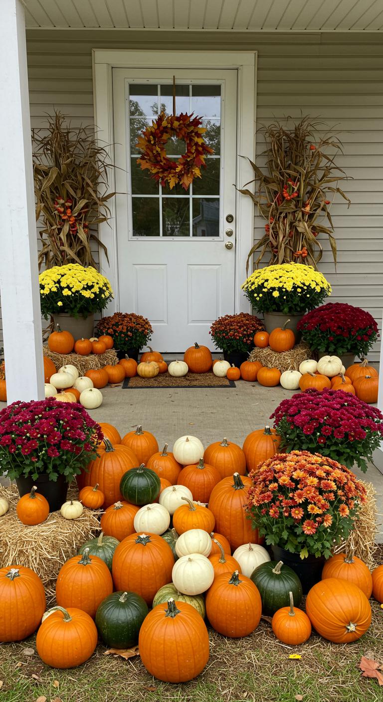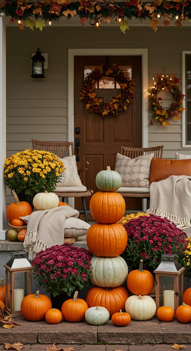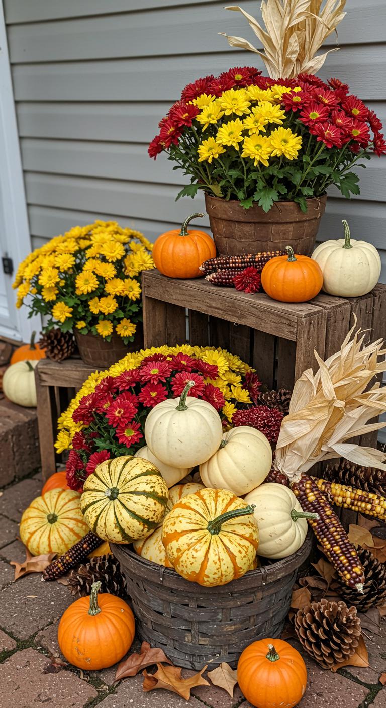 Utilizing vibrant fall colors, one can stack pumpkins of varying sizes and hues, grouping them with cheerful mums or other seasonal flowers.