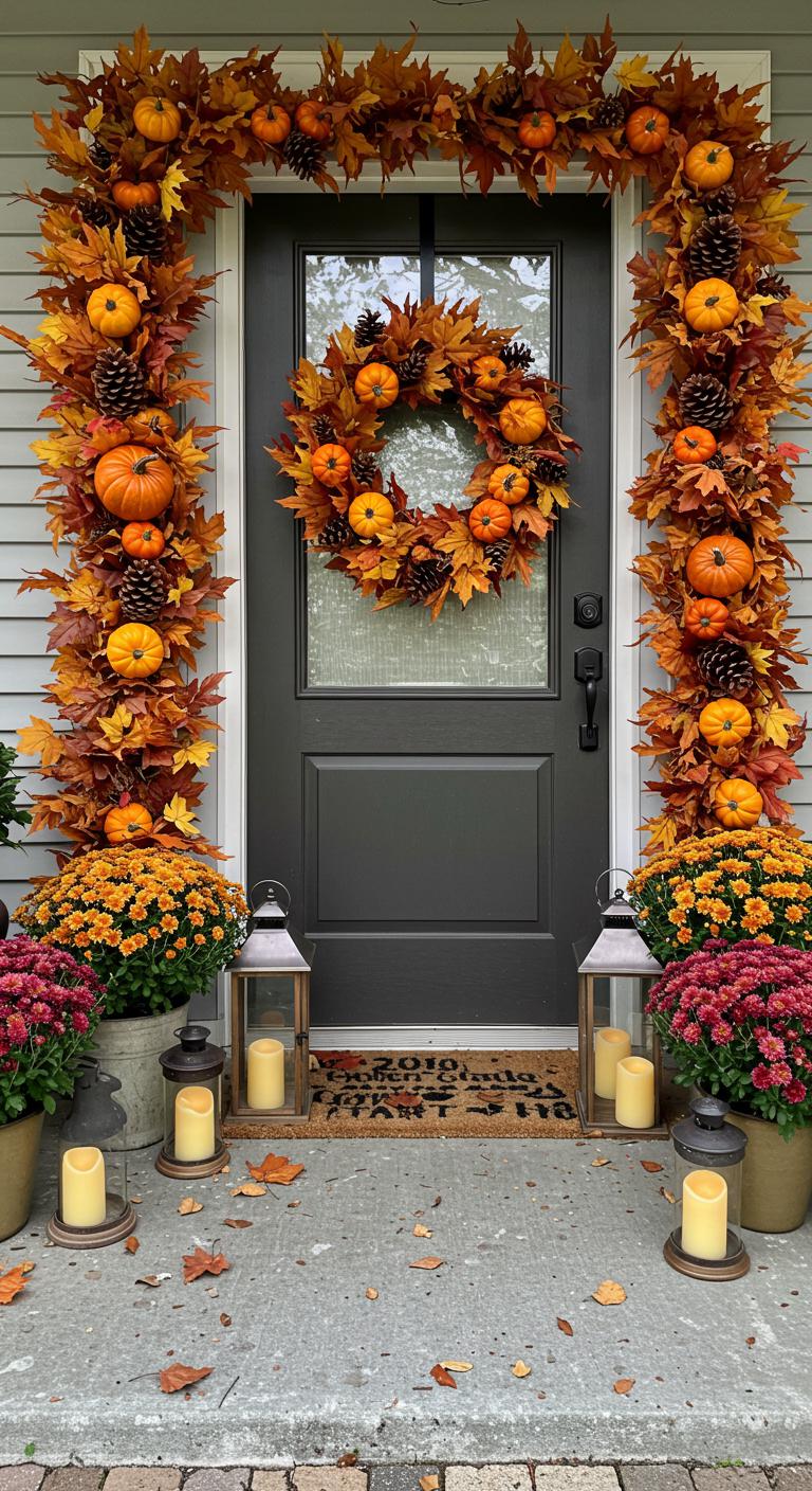 Autumn doorway decor serves as an inviting introduction to the seasonal charm that awaits beyond the threshold. A vibrant door wreath made of dried leaves or faux pumpkins instantly captures attention, while a garland adorned with mini pumpkins and pinecones enhances the festive atmosphere.