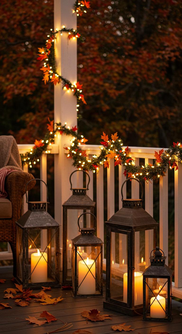 Lanterns flicker softly, casting a warm glow that transforms the porch into a cozy haven during the crisp fall evenings. Various lantern styles, from rustic metal to glass, add character and charm to the space.