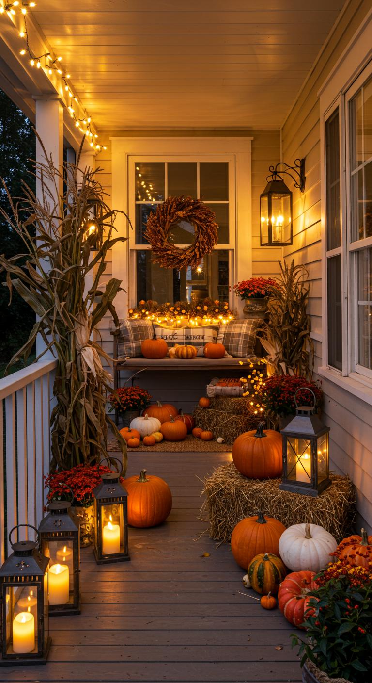 As the ambiance of the porch is enhanced by the soft glow of lanterns and fairy lights, the introduction of harvest-themed accents brings a delightful touch of seasonal charm.