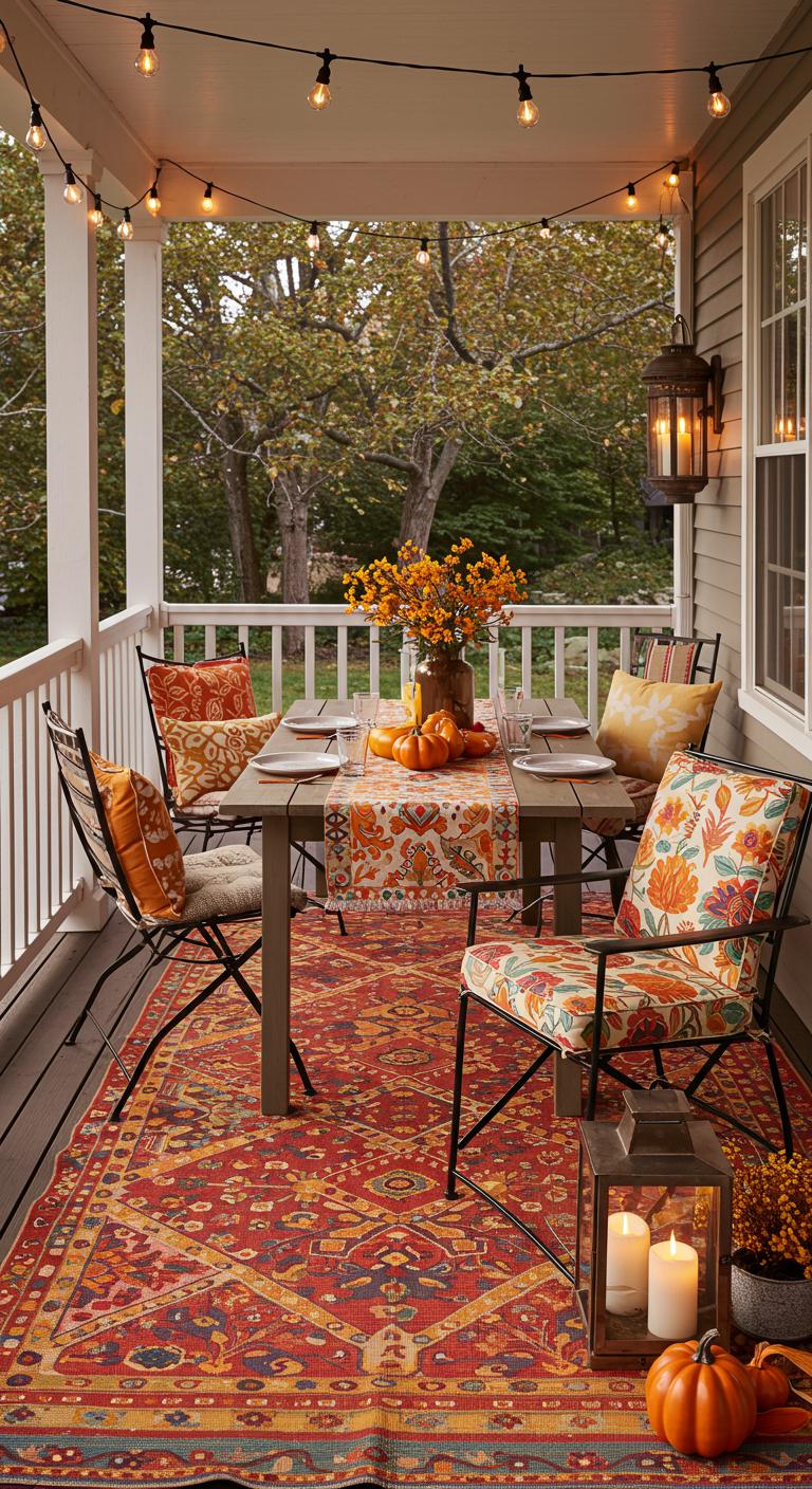 Vibrant rugs, featuring warm autumn hues, define seating areas and add a cozy touch. A simple wooden table adorned with colorful tablecloths sets the stage for delightful fall recipes, inviting friends and family to gather and enjoy.
