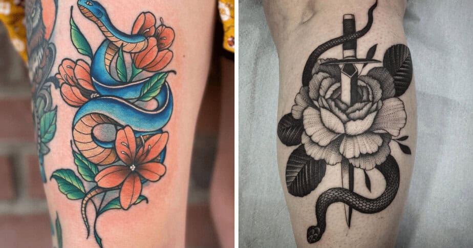 I have a soft spot for snake-with-flowers tattoos — they somehow manage to be fierce and tender at the same time. It’s a design that says you survived something, learned from it, and kept your softness. Snakes bring strength, danger, and transformation; flowers bring love, growth, and a little softness. Put them together and you get this gorgeous balance between bravery and beauty. Whether you want a tiny fine-line reminder or a whole-body statement, there’s something here that’ll feel like a small ceremony on your skin. So, I gathered 24 inspiring takes on this combo so you can daydream (or start booking).