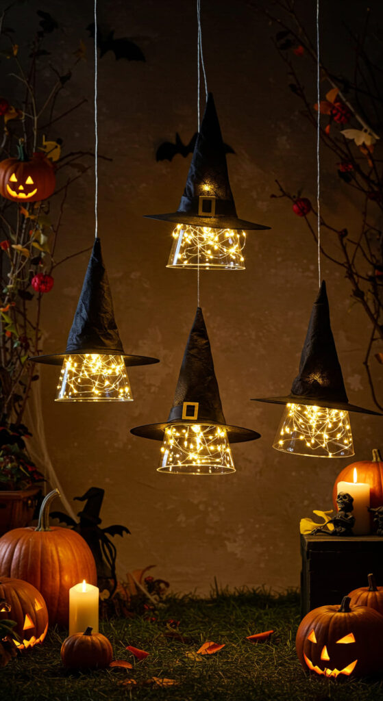 To craft these delightful accents, simply turn upside-down witch hats into charming light fixtures by inserting fairy lights inside. For ideal effect, suspend them using clear fishing line for an invisible appearance.