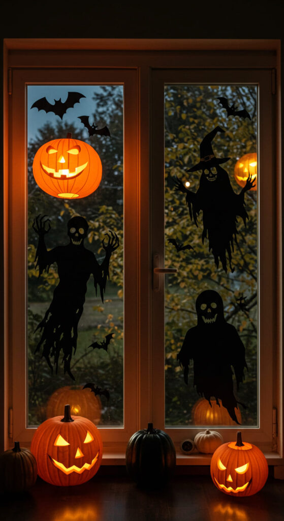 Creating a spooky atmosphere doesn’t stop at lanterns; DIY spooky home window silhouettes can elevate the Halloween spirit even further. Utilizing black cardstock and a pair of scissors, individuals can craft chilling spooky silhouette designs that dance on their windows when illuminated from behind. Personal creativity shines through as they customize their designs with personal drawings or downloadable templates, making each display unique. These window decoration ideas not only enhance the eerie ambiance but also pique the curiosity of passersby. Secured easily with tape, these silhouettes transform ordinary windows into haunting masterpieces that capture the essence of Halloween.