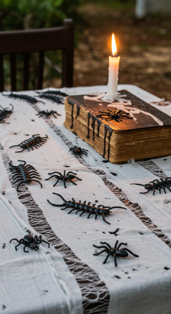 Picture a torn white tablecloth, artfully arranged to mimic cobwebs, while scattered plastic centipedes and spiders add a touch of fright.