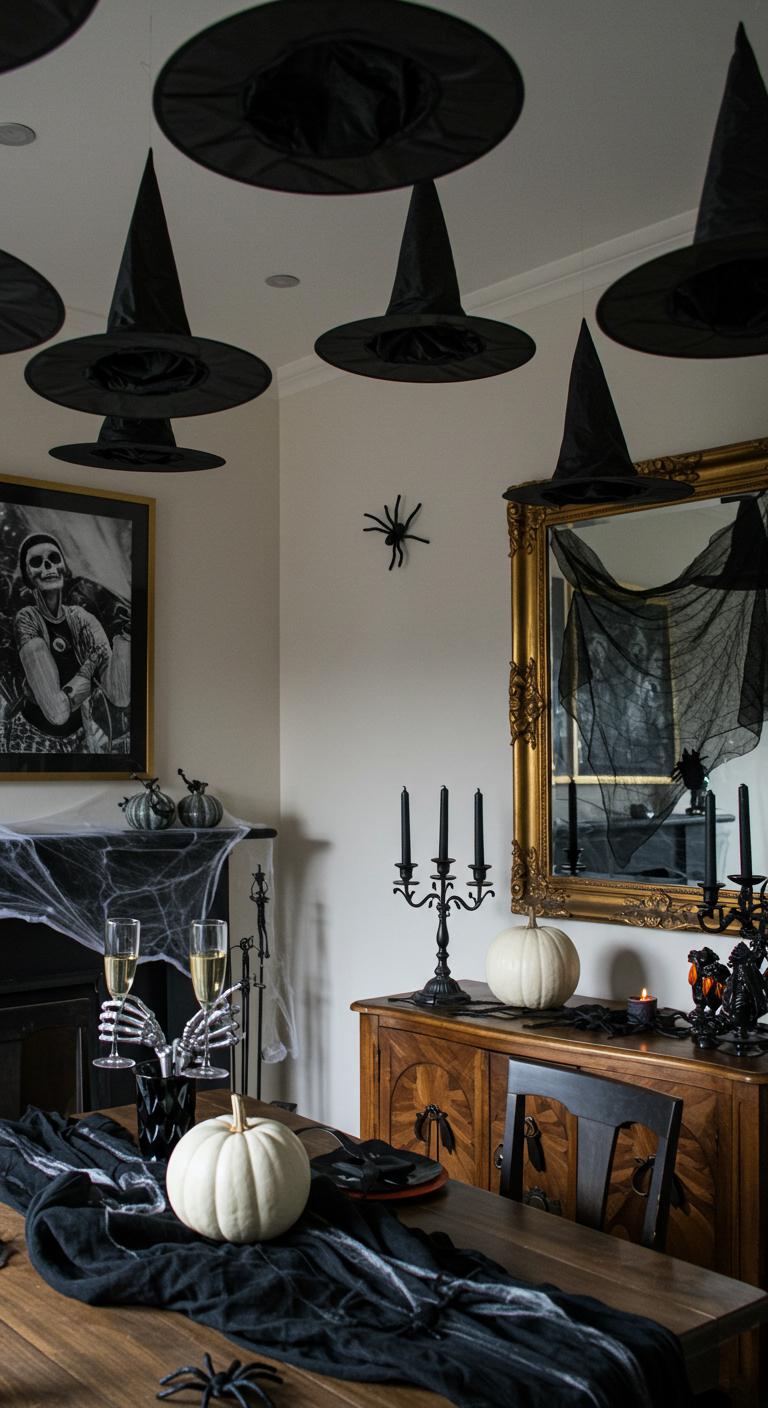Witch hats, with their iconic pointy silhouettes, create a whimsical yet spooky ambiance in any living room during Halloween. Hanging black witch hats from the ceiling evokes a playful witch theme, while silver skeleton hands holding champagne flutes add a quirky twist.