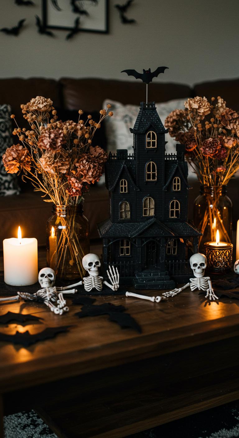 Picture a haunting black miniature haunted house perched atop, surrounded by glowing skeleton candles that flicker ominously. Dried brown flowers in amber jars create a rustic feel, while scattered felt bats add a playful touch.