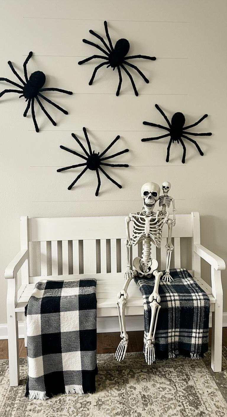Picture a cozy white bench draped in plaid blankets, where a friendly skeleton sports a mini skeleton on its shoulders, bringing a grin to anyone who walks by.