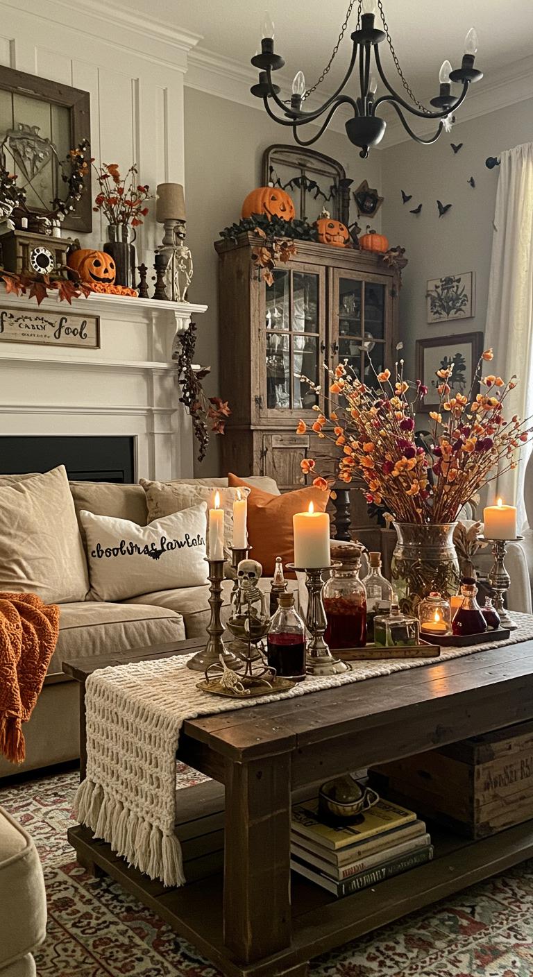 Guests can gather around a coffee table adorned with potion bottles and dried flowers, creating a whimsical yet haunting feel. The atmosphere invites storytelling, laughter, and a touch of fright, making it an enchanting gathering spot for Halloween celebrations.
