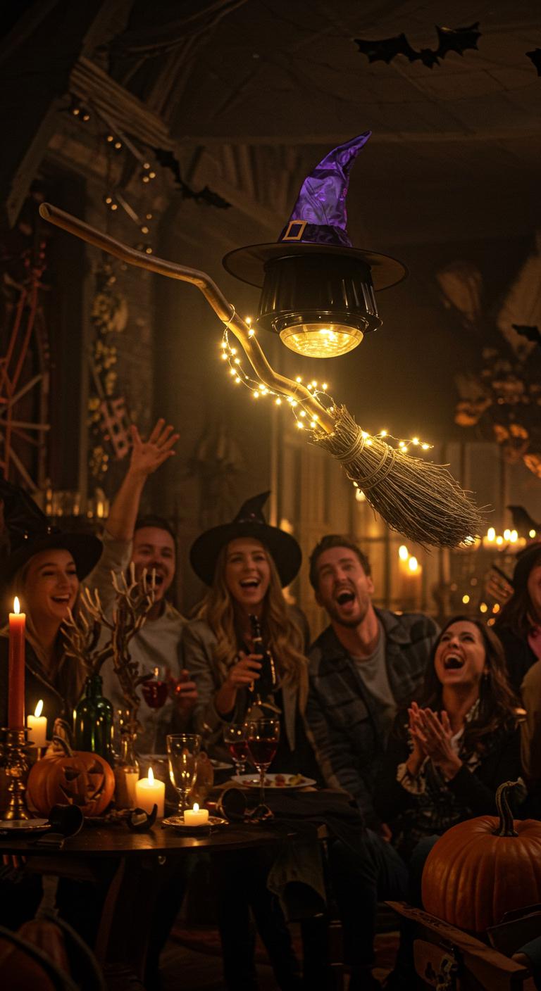 Imagine stepping into a dimly lit room where this enchanting piece hovers, seemingly defying gravity. The broom sways gently, enhanced by flickering lights that create a magical atmosphere.